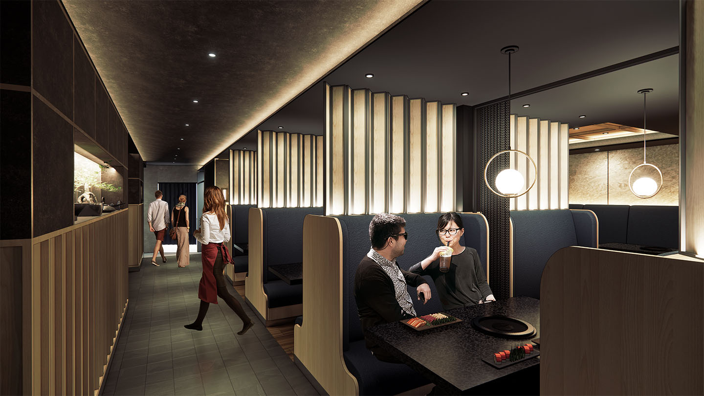 The layout emphasizes spatial rhythm through the use of natural materials: wood, charcoal-gray accents, and textured walls, complemented by warm lighting to evoke a cozy and grounded ambience. Seating is organized in booth arrangements to support semi-private dining, each table equipped with integrated grill stations and discreet exhaust systems for comfort and functionality.