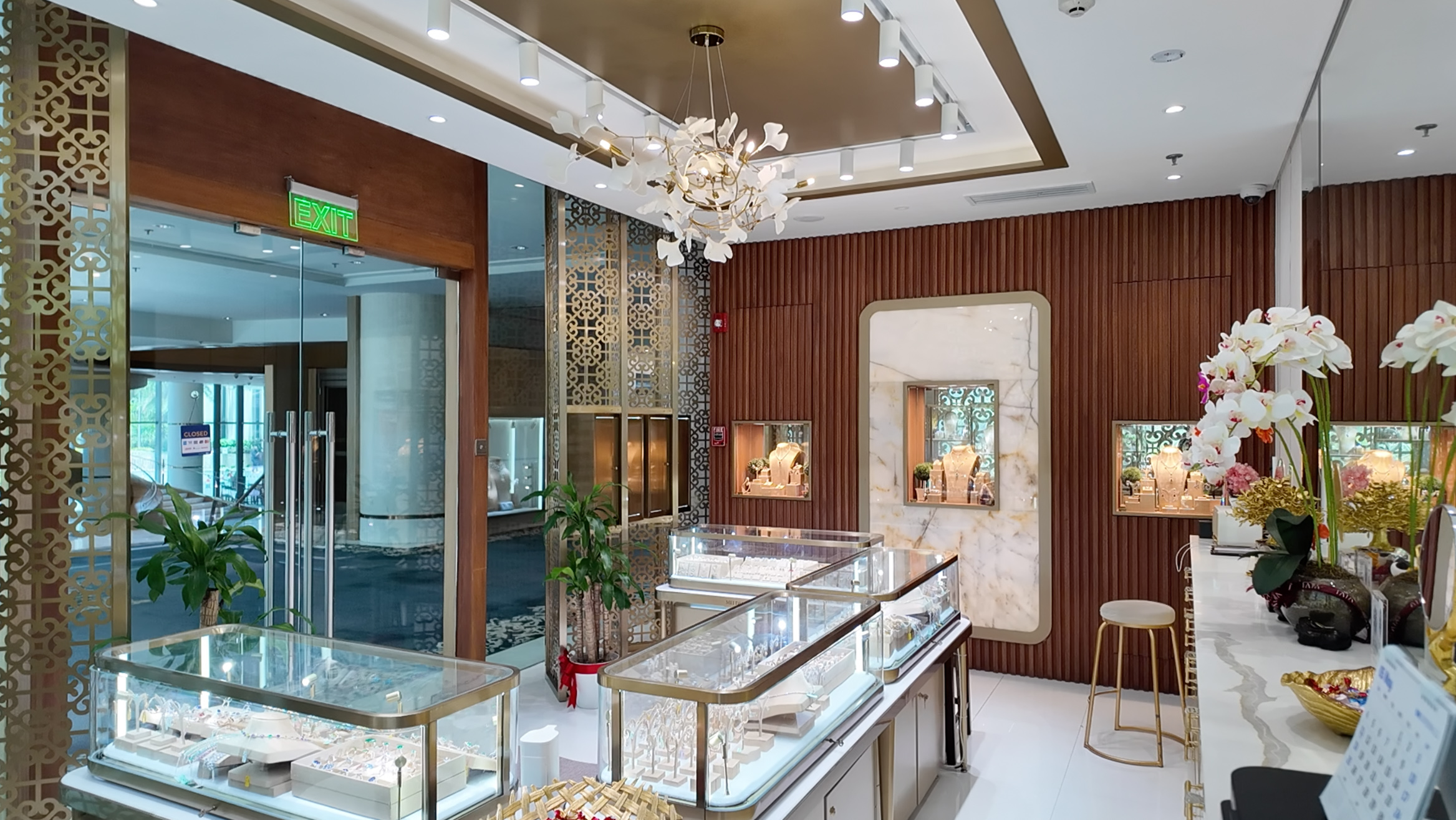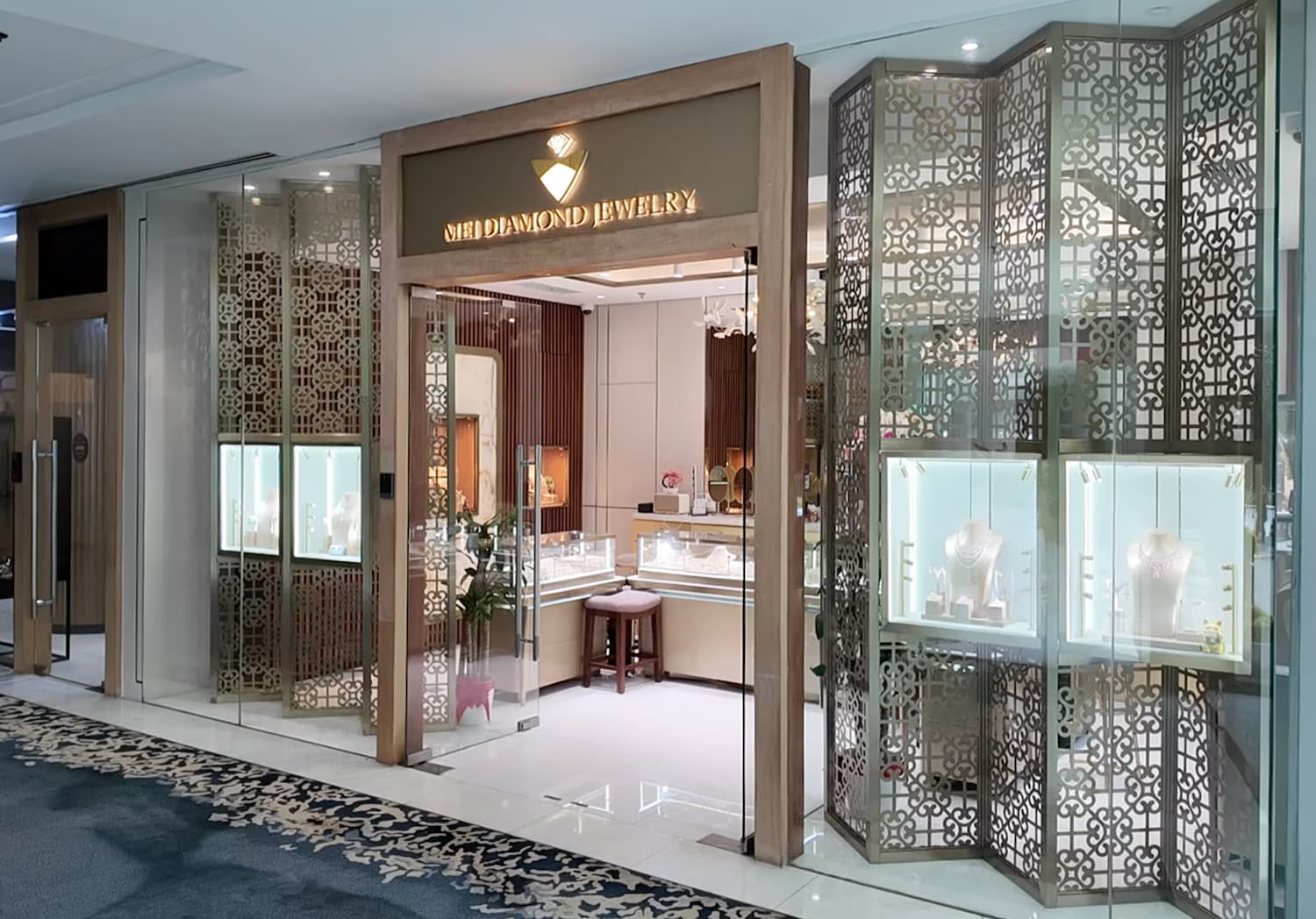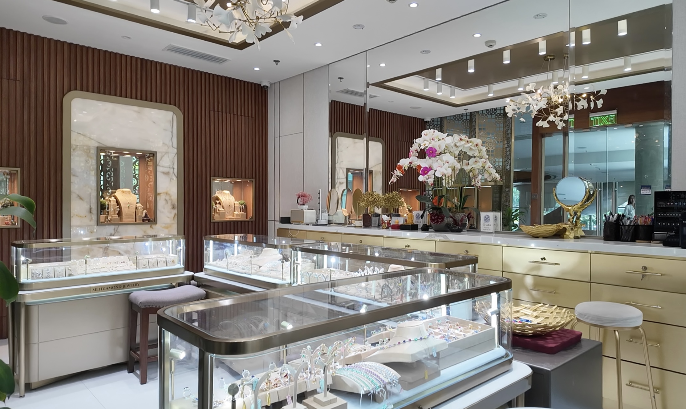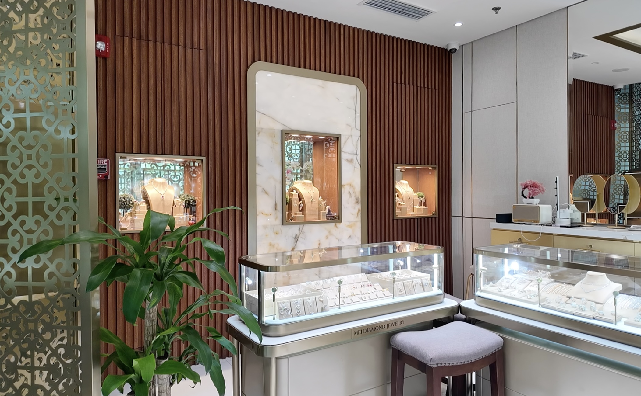 Mei Diamond’s flagship showroom at Shangri-La The Fort embodies elegance, exclusivity, and refined minimalism. The design philosophy centers on creating a luxurious, high-end retail space that elevates the jewelry browsing experience while conveying timeless sophistication.