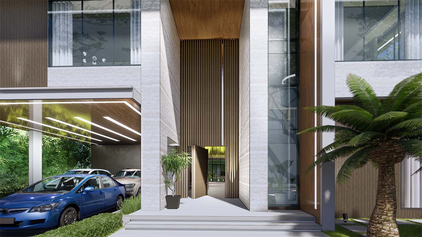 The design maximizes the use of the site through efficient spatial planning and seamless indoor-outdoor connections. Landscaped pockets and transitional zones soften the boundaries of the built environment, while garage access and service areas are discreetly tucked away for functionality and visual clarity.